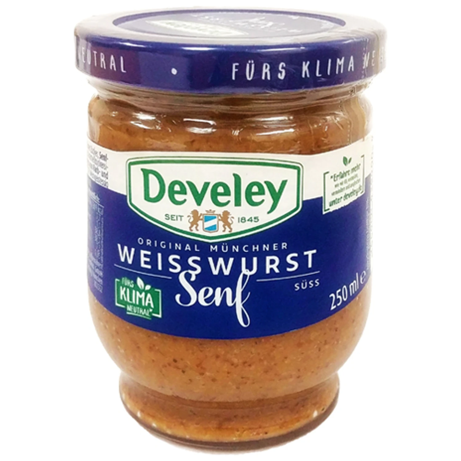 An iconic Bavarian sweet mustard brand, produced in Unteraching, Bavaria, by Develey.