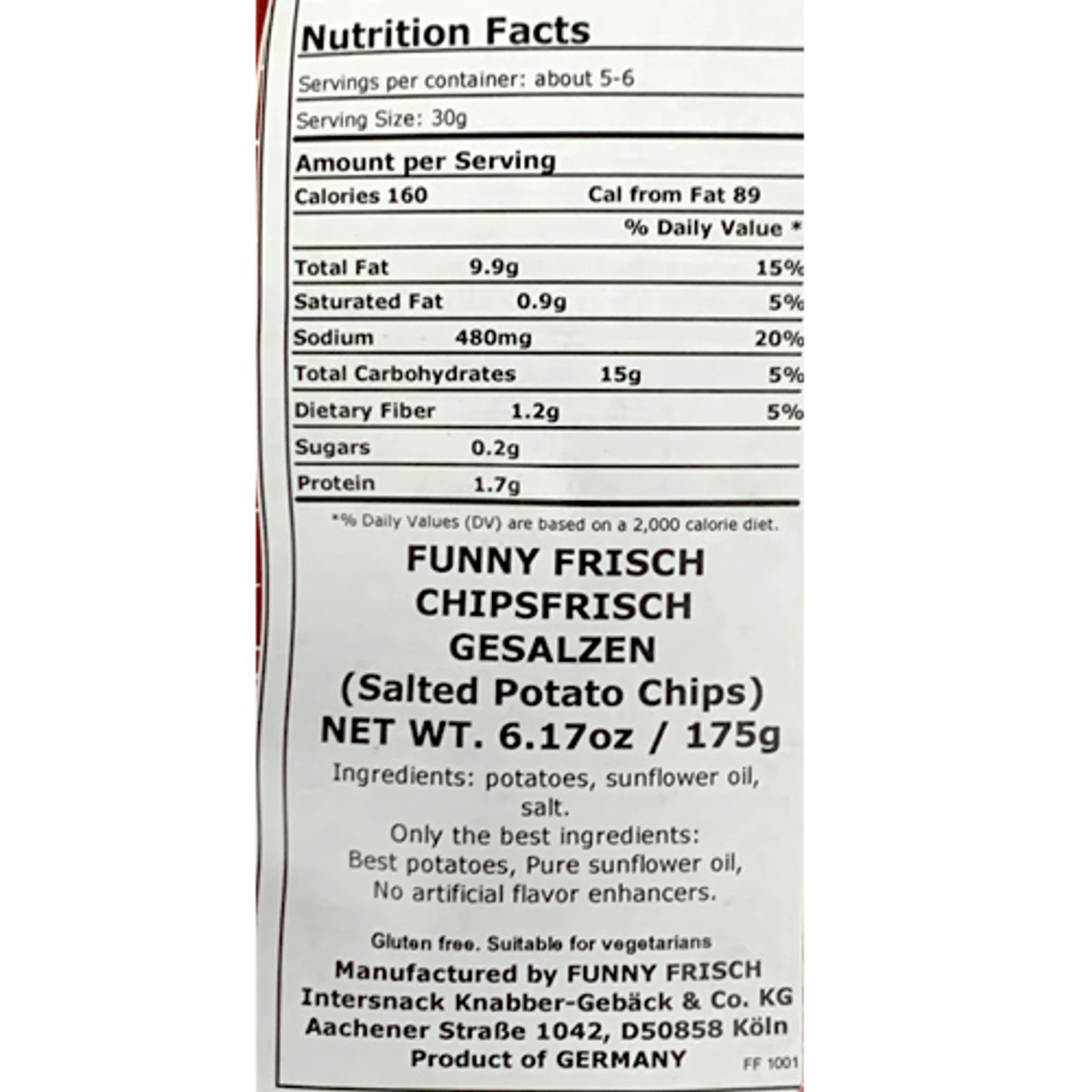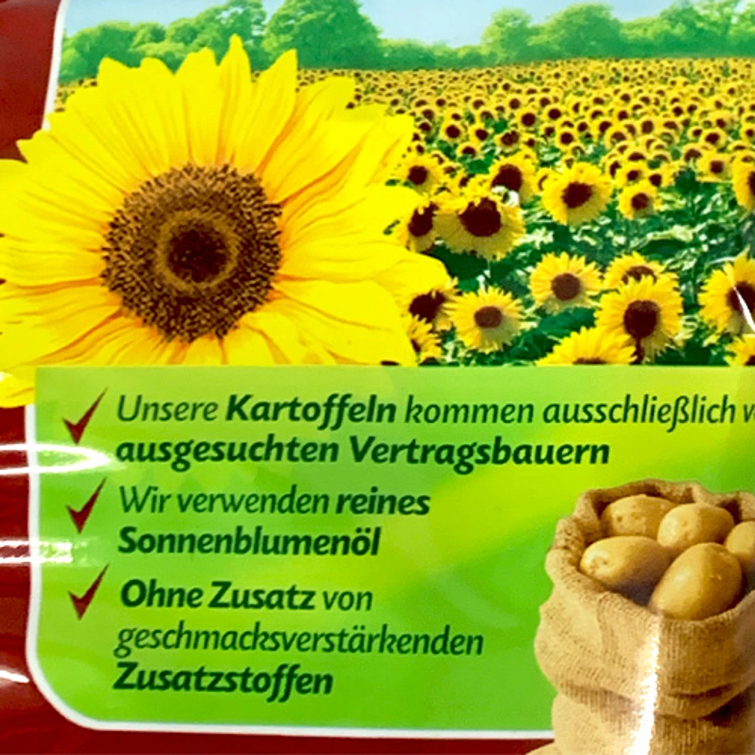 Crunchy, thinly sliced potato chips, from German spuds, roasted in sunflower oil and lightly salted. No other ingredients. Eat them right out of the bag or add to salads or soups. Goes well with German beer.