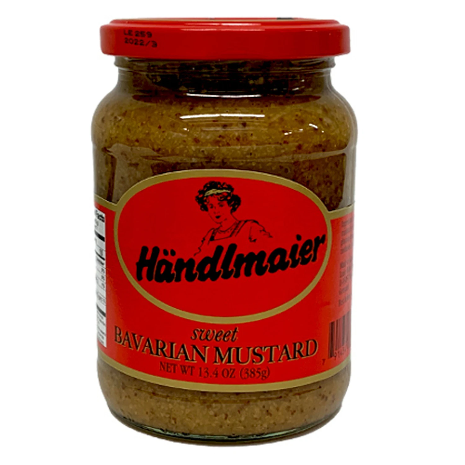 An iconic Bavarian sweet mustard brand, produced in Regensburg, Bavaria, by Haendelmeier. A great complement to Weisswurst and Bavarian pretzels. In large glass jar.