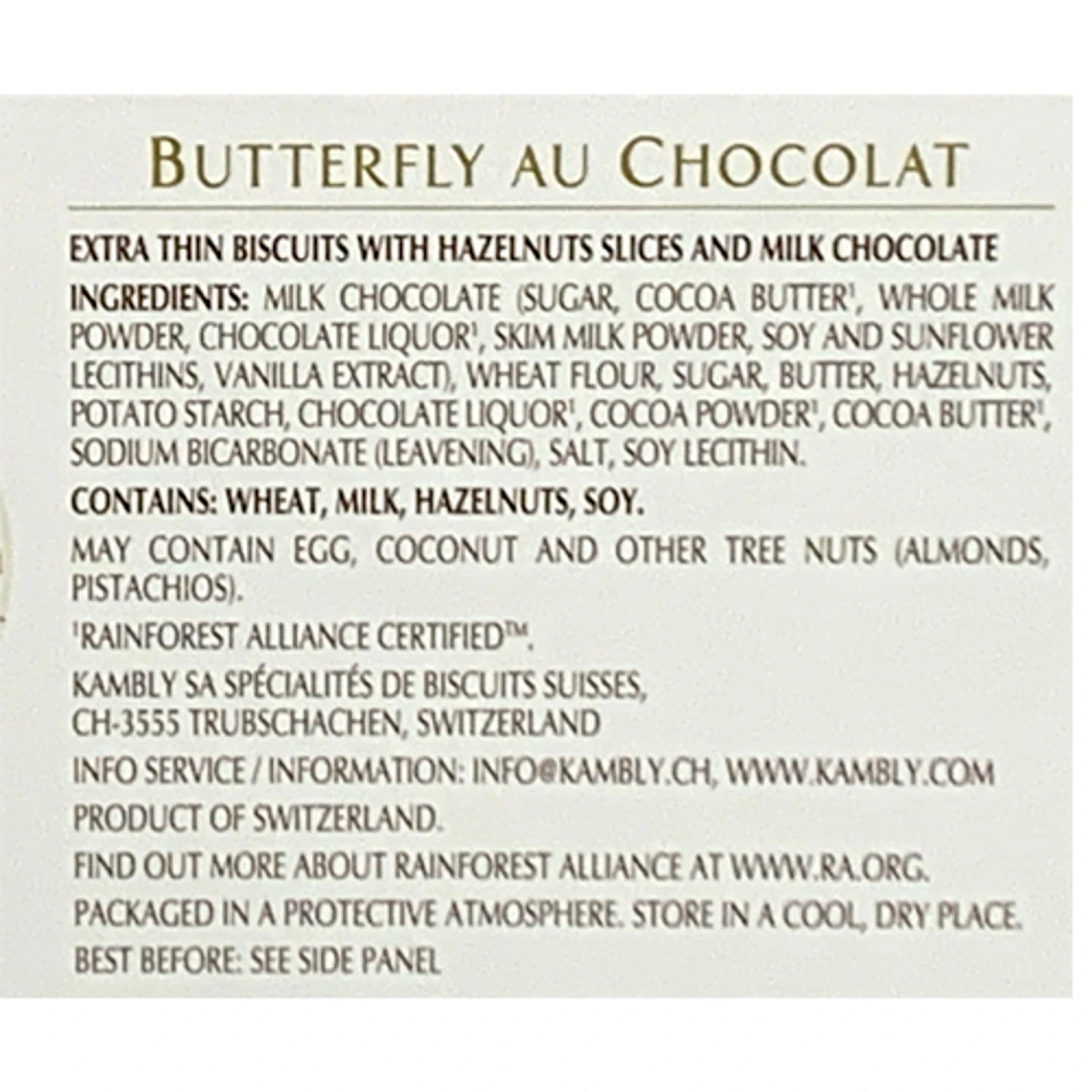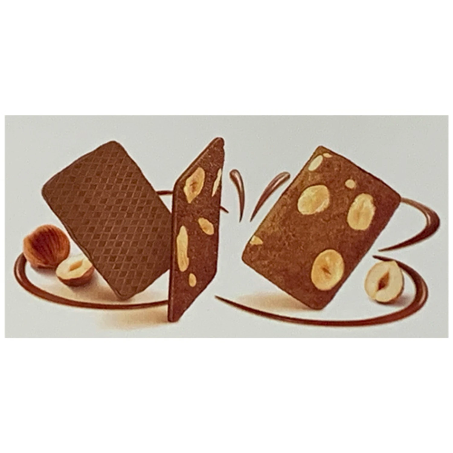Extra thin butter chocolate cookies with whole hazelnut slices. A perfect, great tasting Swiss biscuit delicacy for the afternoon or after dinner. Enjoy with German tea, coffee or hot cocoa.