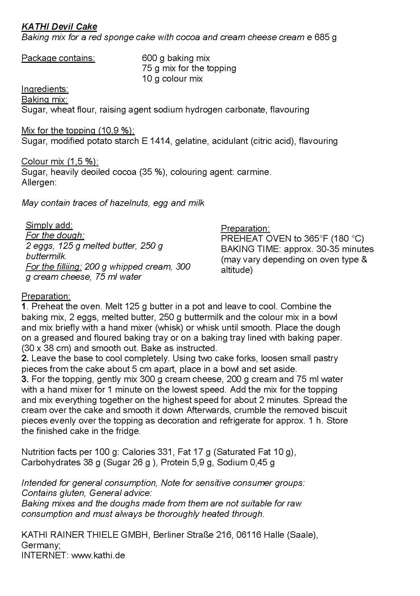 Serve your guests at the Halloween, Carnival or Birthday parties this delicious German “Teufelskuchen” (literally: devil’s cake). In the US it is known under a less scary name “Red Velvet Sponge Cake with Cream Cheese Frosting.” All dry ingredients are included, just add eggs, butter, créme fraiche, heavy cream and buttermilk. No artifical colors.