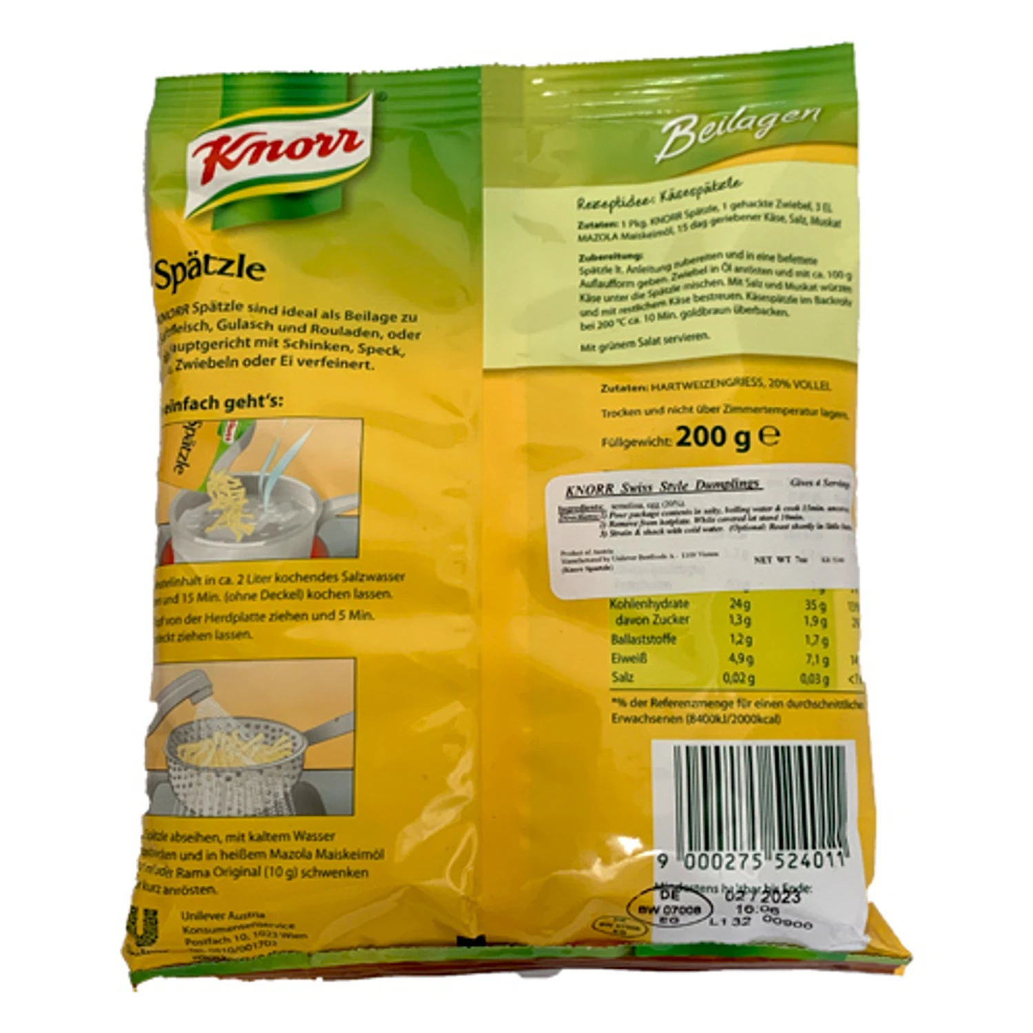 Delicious Spaetzle egg noodles, made in Austria under the Knorr brand. Made from premium quality semolina wheat and eggs (20%). Simply add to boiling, salted water, cook for 15 minutes without lid, remove from heat and rest in the hot water for another 5 minutes, rinse briefly under cold water. Add butter or oil and serve.