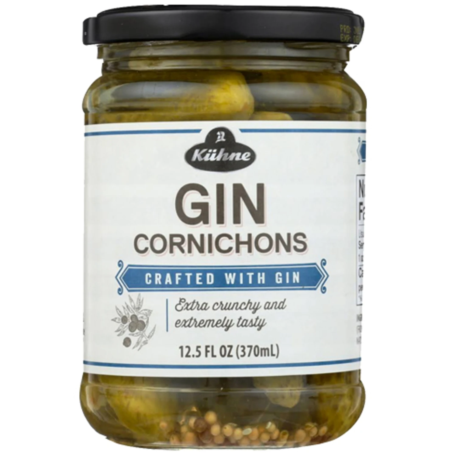 Try these extra crunchy German gherkins preserved in vinegar and dry gin. Tasty juniper and fresh citrus notes provide a fruity sharp finish. A fun gift and tasty appetizer.