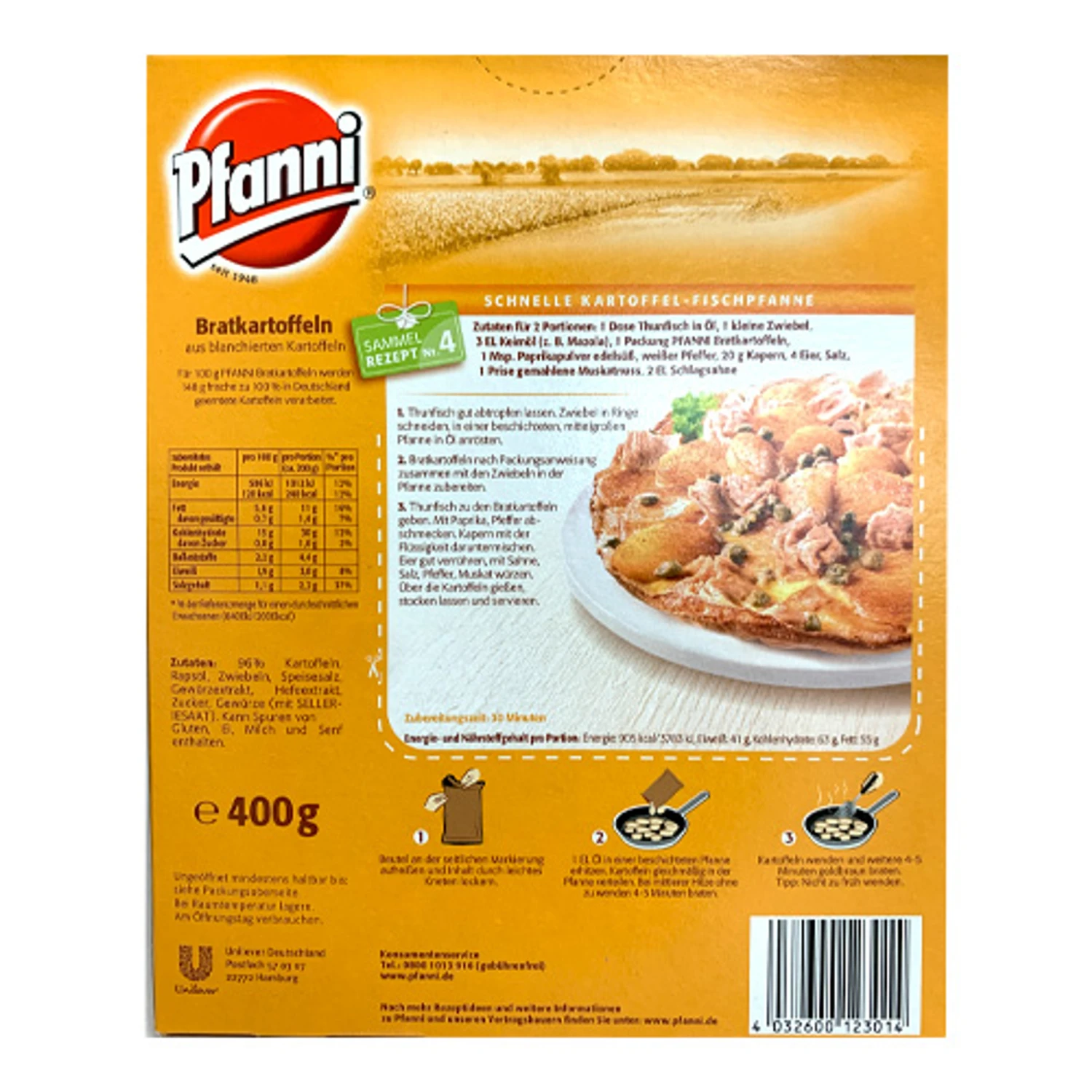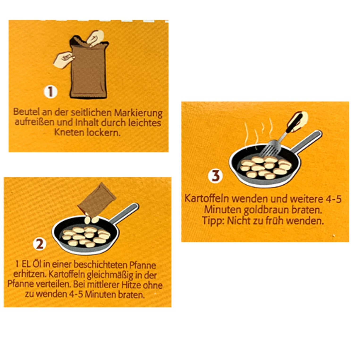 These classic and convenient Bratkartoffeln (German fried potatoes) make an easy, quick, nourishing and heart meal. Add any meat, fish or vegetables, or eat solo just with ketchup or mayonnaise. This pack makes about 2-4 portions.