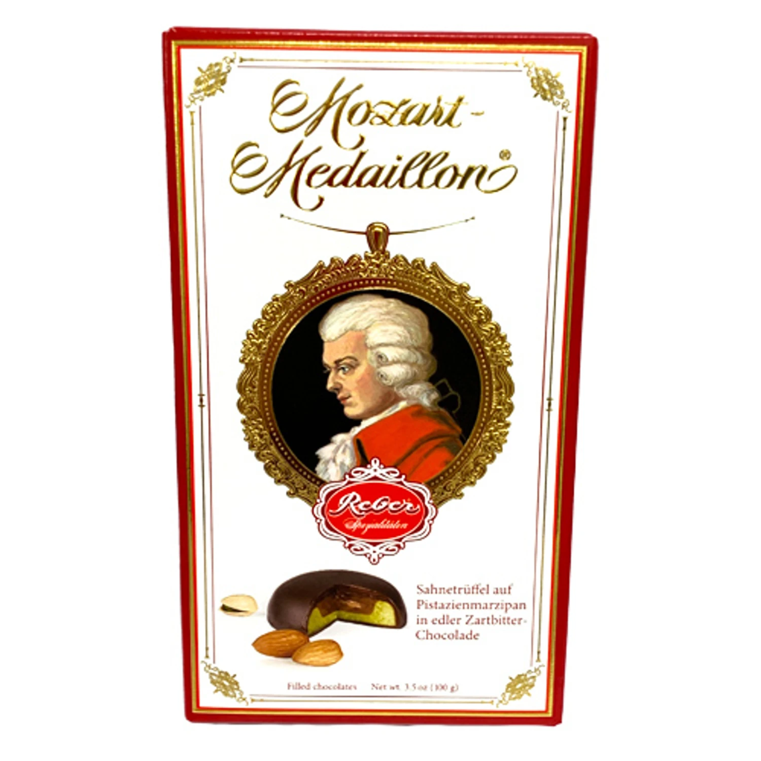 Reber’s world famous Mozart Kugel in round medallion shape; with pistachio marzipan and nougat cream, covered in dark chocolate.