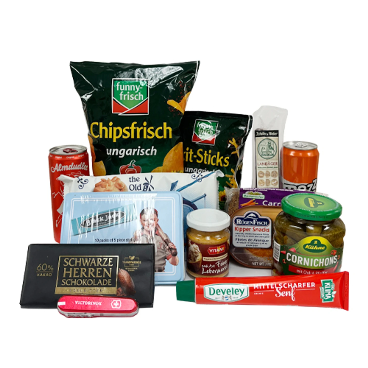 Included are savory snacks, like paprika-flavored potato chips, Landjäger salami and a traditional plant-based fine “liverwurst” spread, cornichons and whole grain bread; and sweet delights such as a Swiss-Army-knife-shaped chocolate and a dark “For Gentlemen” chcoolate bar, German “bonbon” hard candy in tin and unique sodas.